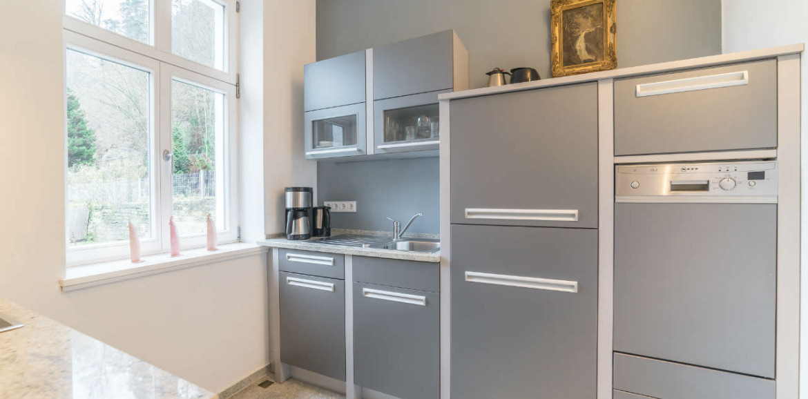 Kochen: Küche mit Herd, Backofen und Geschirrspüler – für das perfekte Dinner zu zweit.