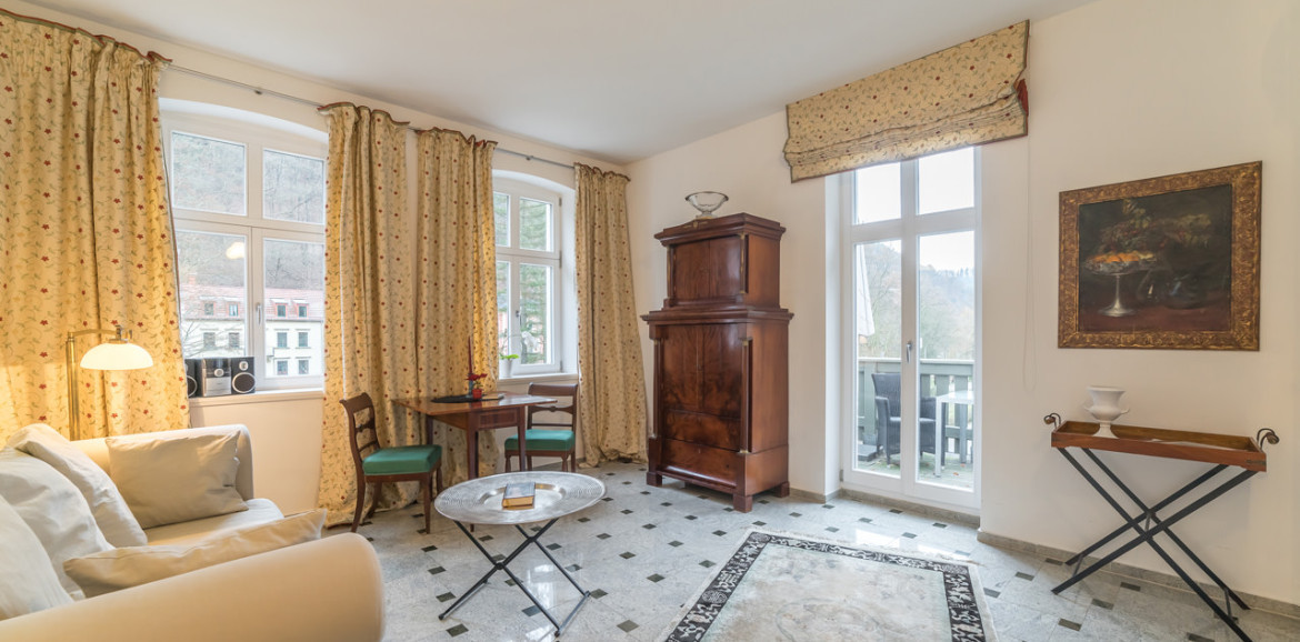 Das Apartment befindet sich im Hauptgebäude im 2. Obergeschoss (links) unseres Hauses Saxonia. Dank der erhöhten Lage genießen Sie auf Ihrem Balkon Ruhe und Weitblick.